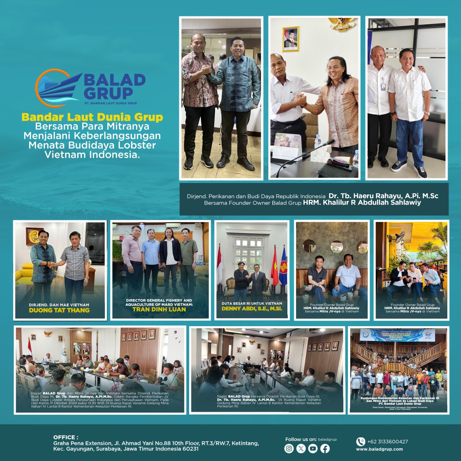 HRM. Khalilur R Abdullah Sahlawy menyampaikan bahwa dirinya hanya sebagai rakyat Negara Kesatuan Republik Indonesia selaku nelayan nusantara, Pendiri dan Pemilik Induk Perusahan Bandar Laut Dunia Grup – Balad Grup mulai sejak sedang merintis Usaha Perikanan Budidaya. Ingin Berbudidaya Lobster di Dalam Negeri (Republik Indonesia) dan di Luar Negeri (Republik Sosialis Vietnam) diberlakukan sangat istimewa oleh Pejabat Indonesia.